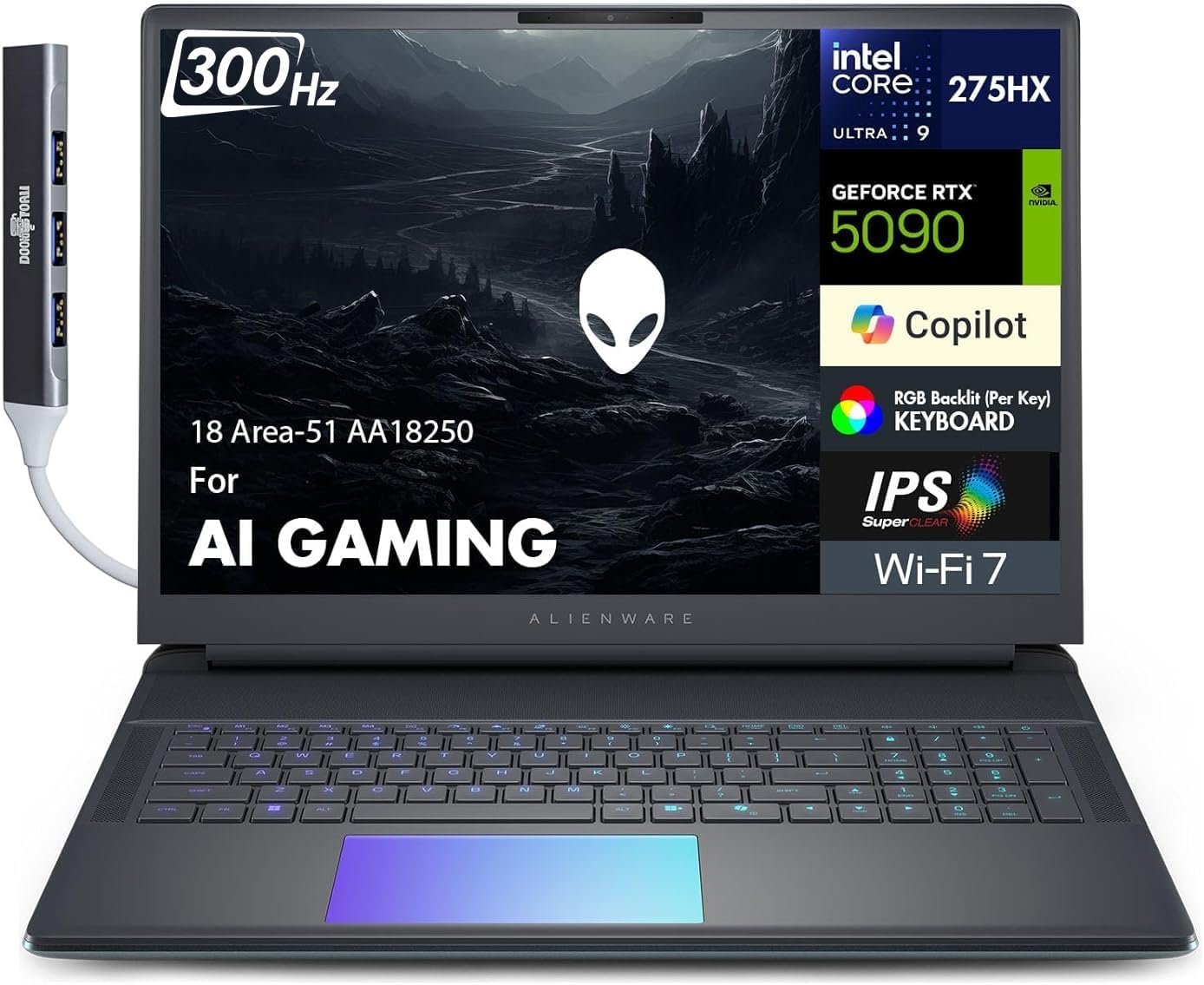 Configuration We offer all of the following configurations, if you cannot find the correct listing please check for other listings on our Store page. Model Alienware 18 Area-51 AA18250 Form/Color Standard/Liquid Teal Color Display 18″ IPS WQXGA (2560×1600) 144Hz 16:10 Display RAM Memory 64GB DDR5 SO-DIMM RAM Hard Drive Customizable Storage: 2TB PCIe SSD, 4TB PCIe SSD, 8TB PCIe SSD, 3x1TB PCIe SSD (RAID 0), 3x2TB PCIe SSD (RAID 0), 3x4TB PCIe SSD (RAID 0), 3x8TB PCIe SSD (RAID 0) (Solid State Drive) Operating System Window 11 Professional (Win 11 Pro-64), Window 11 Home-64 Processor Intel Ultra 9- 275HX 2.70GHz Processor (15th Gen, upto 5.4GHz, 36MB Cache, 24-Cores, 24-Threads, 8 Performance-cores) Graphics Card GeForce RTX 5090 24GB GDDR7 Dual (Integrated+Dedicated) Graphics Connectivity Wi-Fi 7, Bluetooth 5.4, Ethernet (RJ-45) Ports/Slots 3 x USB 3.2 (Type-A), 2 x Thunderbolt 5, 1 x HDMI, SD Card Reader, 1 x Ethernet (RJ-45) and Headphone/Microphone Combo Jack Other Features Black Per Key RGB Standard Keyboard, Webcam, AI Copilot Battery 360W PSU, 6-Cell 96 WHr Battery Product Dimensions (WxLxH) 12.6 IN x 16.15 IN x 0.95 IN Weight 9.1 lb Includes Includes Authorized Dockztorm Portable USB Hub(Special Edition Portable Dockztorm Data Hub;Super Speedy Data Sync Rate upto 5Gbps)