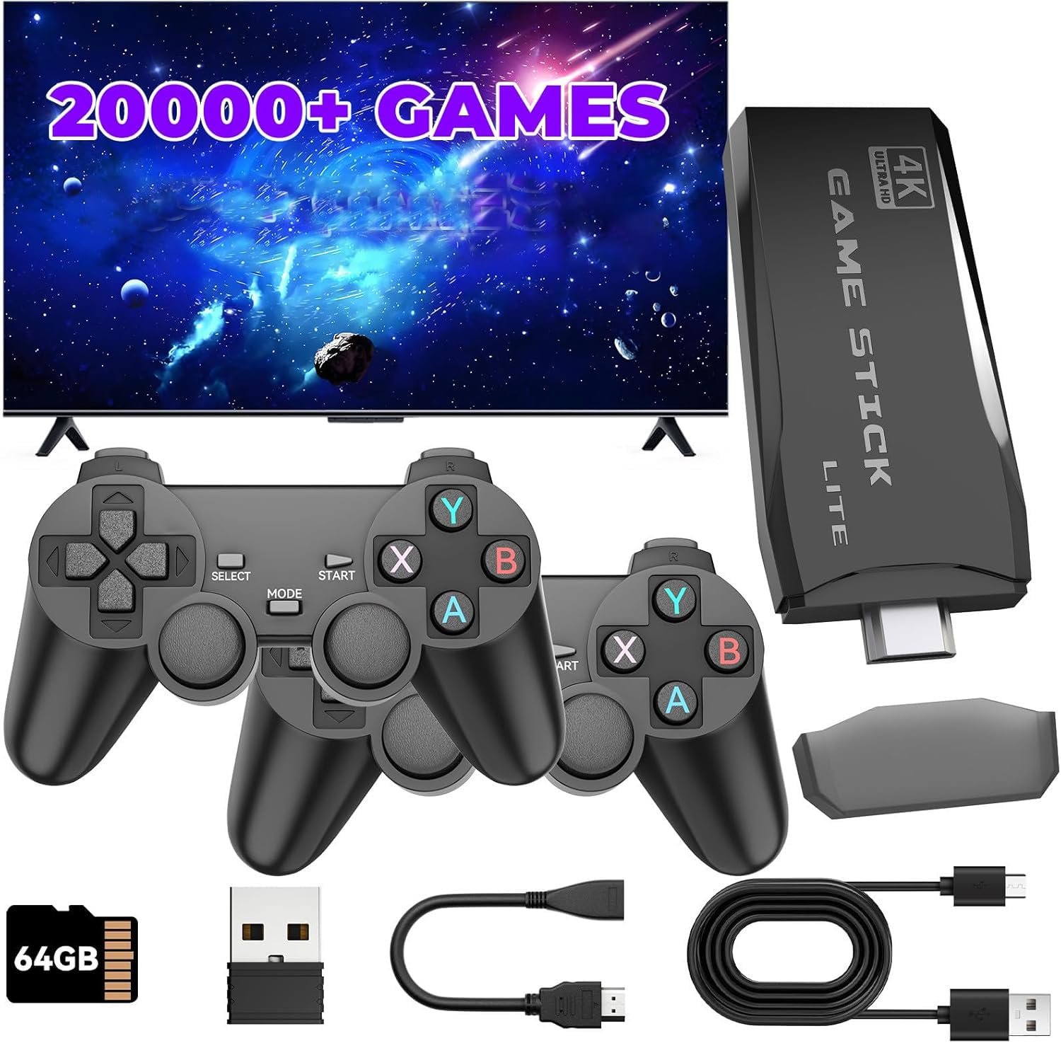 Wireless Retro Gaming Console Stick,Plug and Play TV Video Games Stick Built-in Retro Drive 20000+ Games,4K HDMI Output,Dual 2.4G Wireless Controllers (64GB)